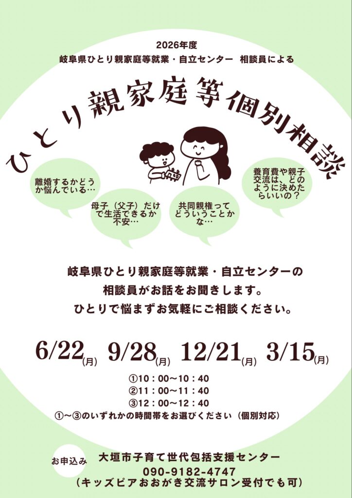 岐阜県ひとり親家庭等就業・自立センター 相談員による「ひとり親家庭等個別相談」を行います。